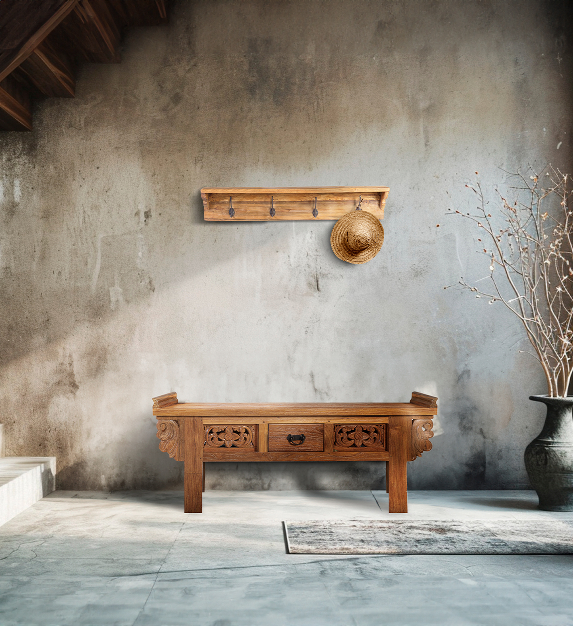 - ESTILO Introduzca un aire de encanto Rústico en su decoración interior con nuestro elegante Perchero de madera de teka reciclada. Nuestro mueble será un aporte práctico y decorativo para su hogar.