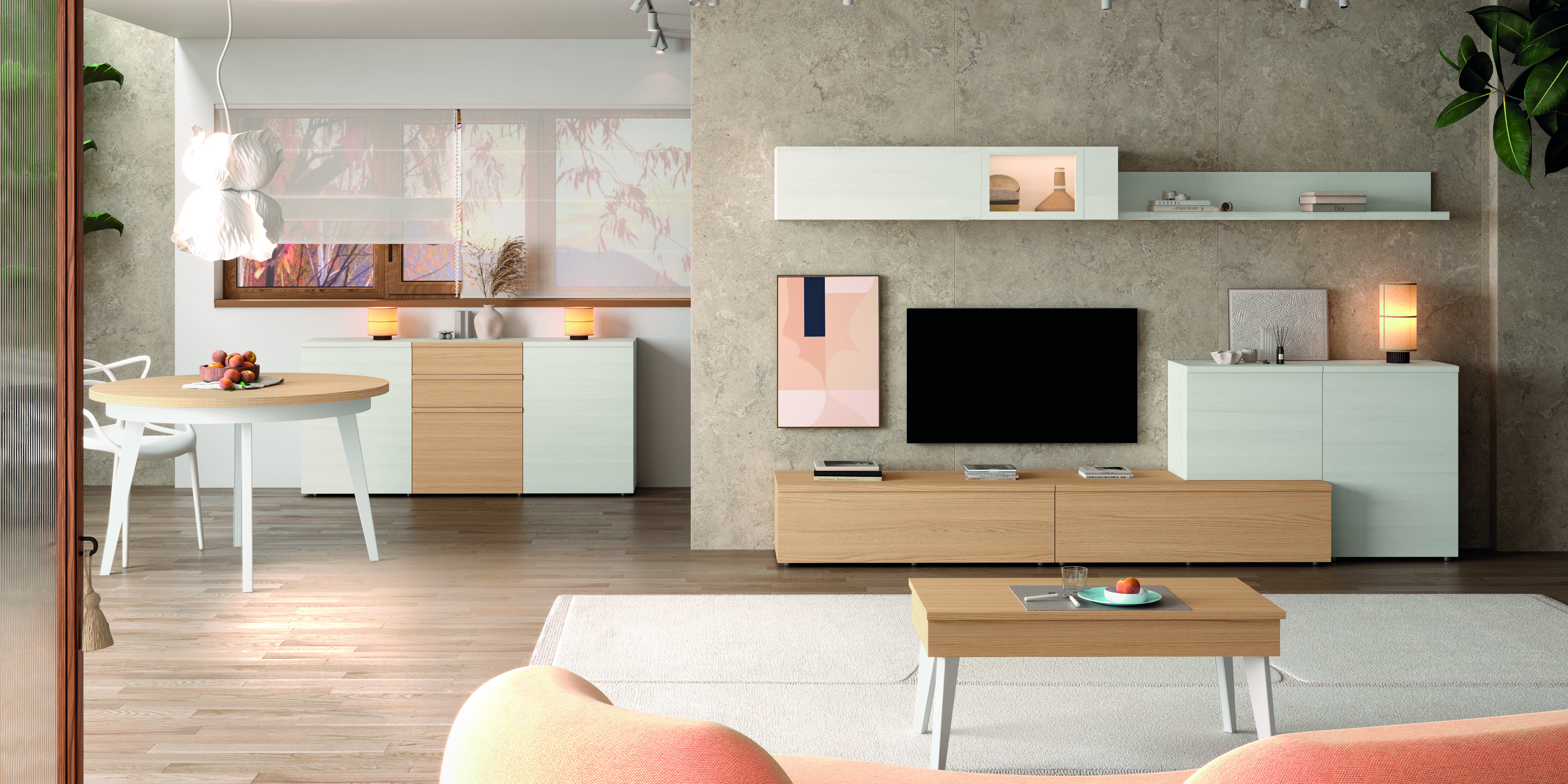 Salón con diseño elegante y práctico con Bajo cajón 120 nuez bajo 1puerta abatible 120 nuez – bajo 2puertas apilado derecha 120 polar – alto colgar 1puerta cristal derecha elevable 150 – estante colgar y panel 150 polar