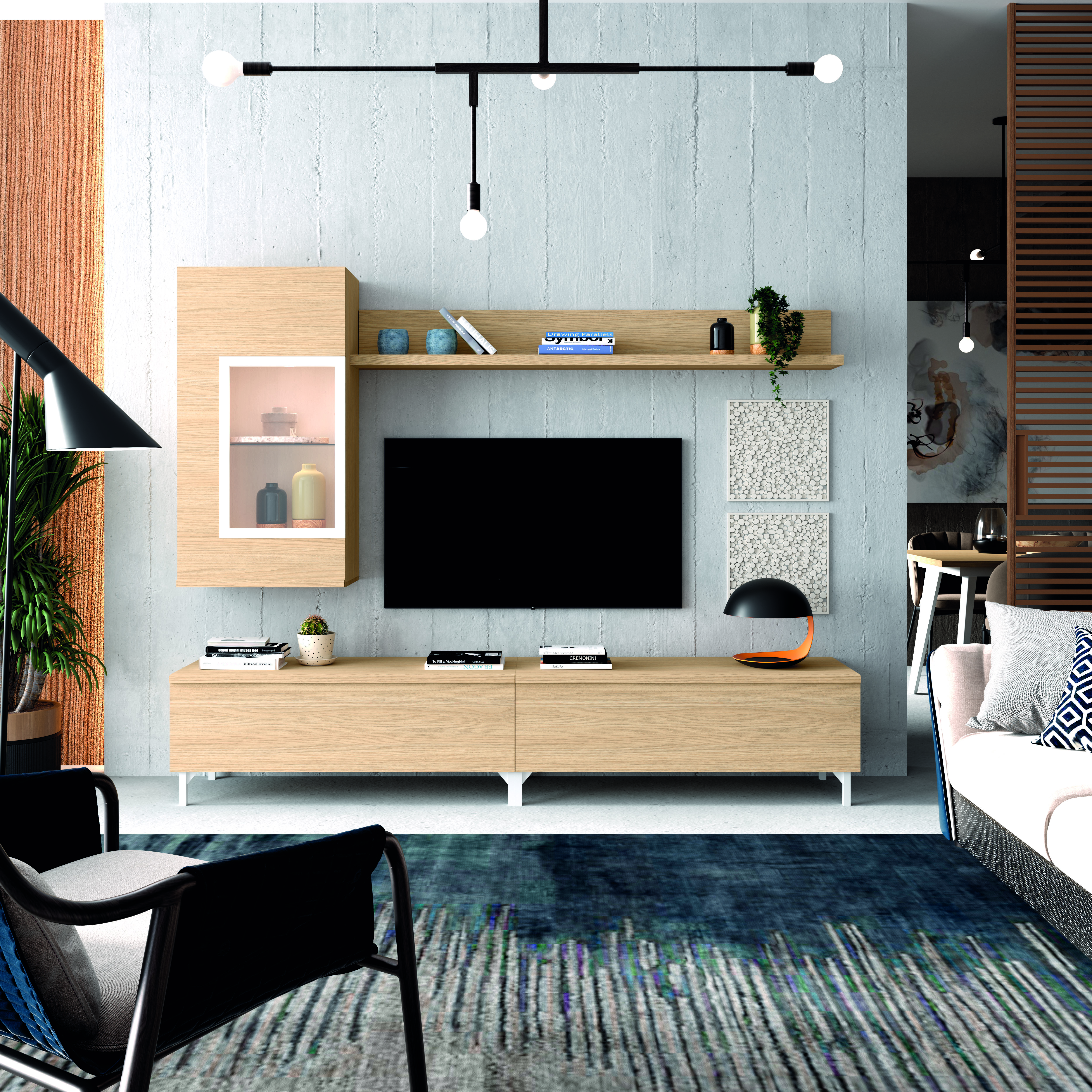 Diseño contemporáneo en el salón con Bajo 1puerta abatible 120 polar tapa tv soportes cristal y panel trasero – alto colgar 1puerta madera elevable 120 – estante colgar y panel 120 polar