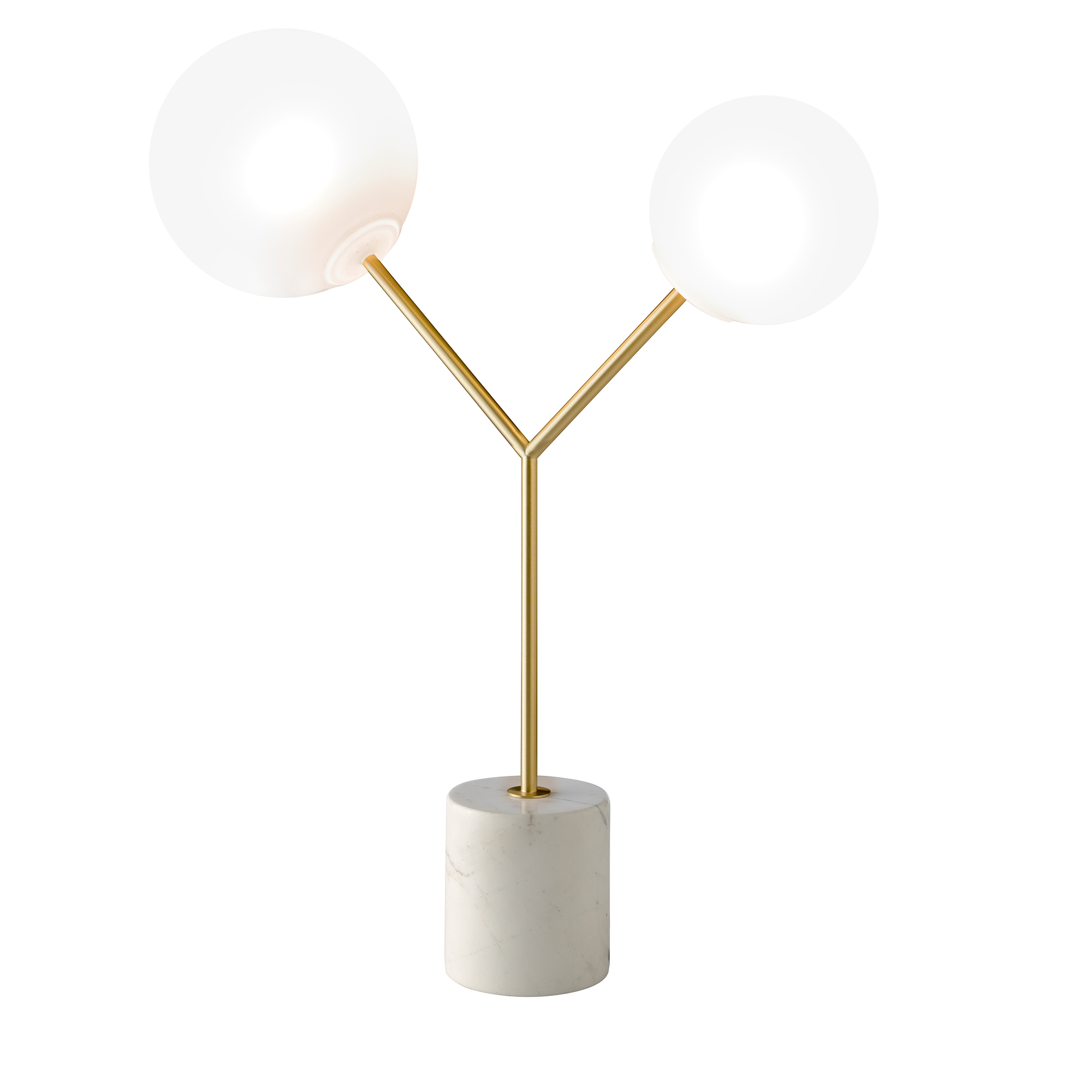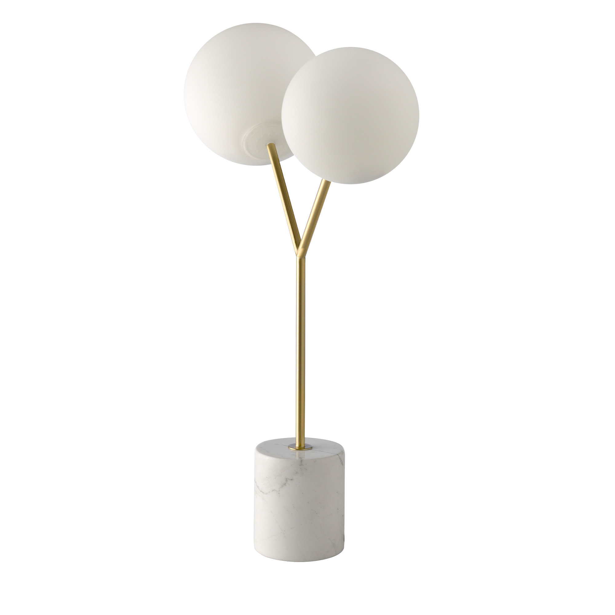 • ESTILO: Lampara de Diseño Italiano. Lámpara de sobremesa con base de mármol porcelánico similar calacatta , cuerpo en acero dorado. Dos bulbos de cristal tintado en color blanco.