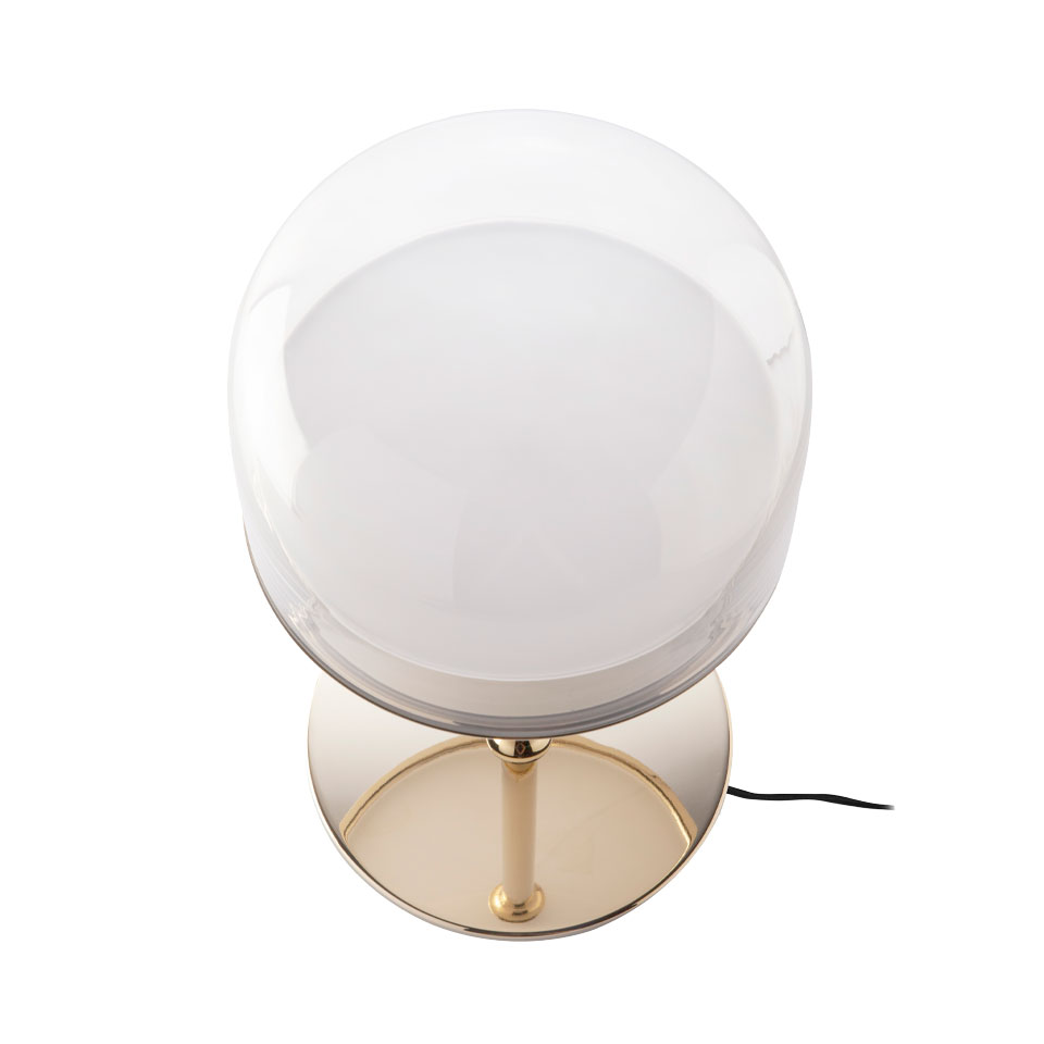 Lámpara de sobremesa con cuerpo, base y detalles en acero dorado. Pantalla con forma de cúpula de cristal transparente.