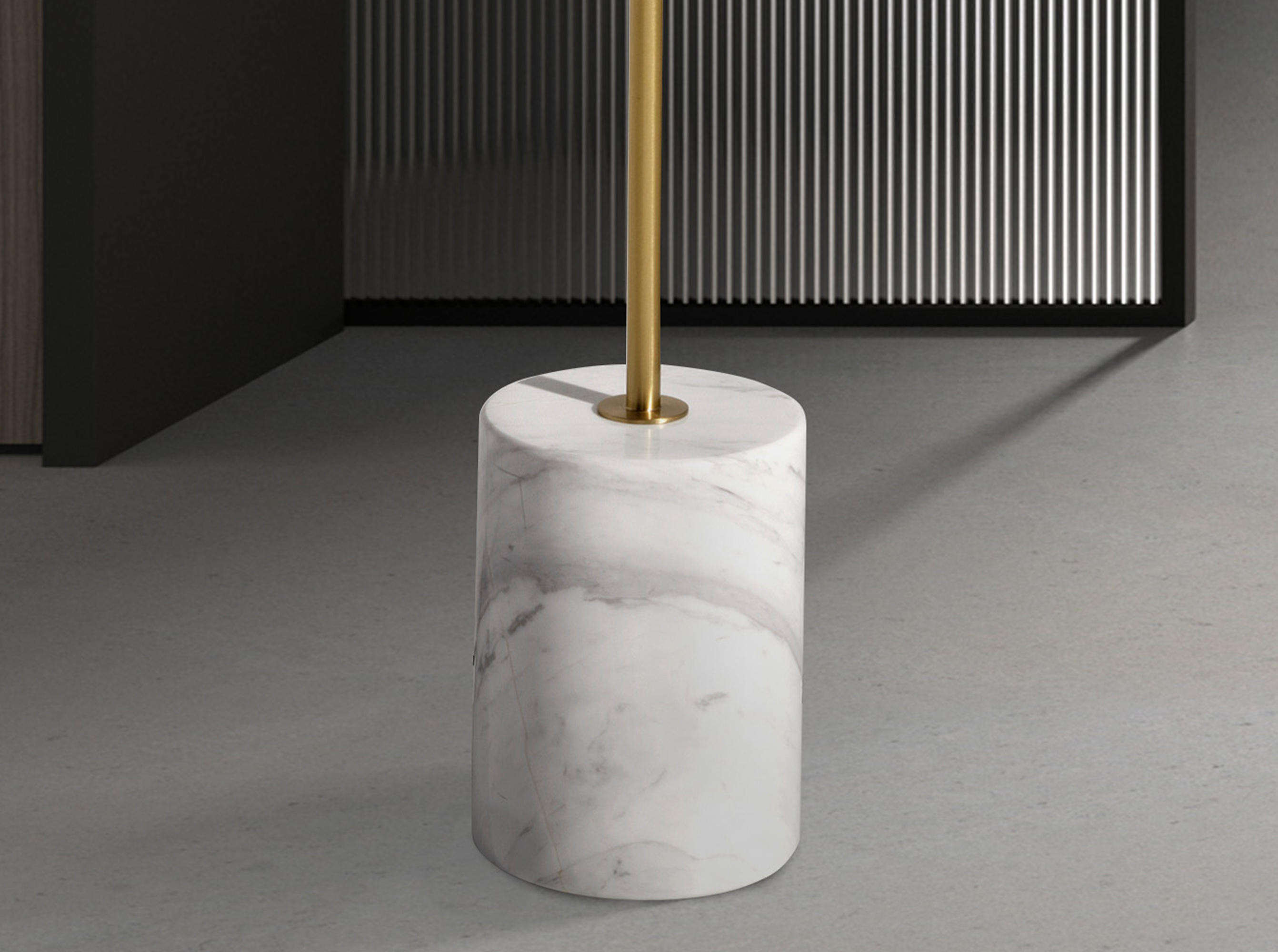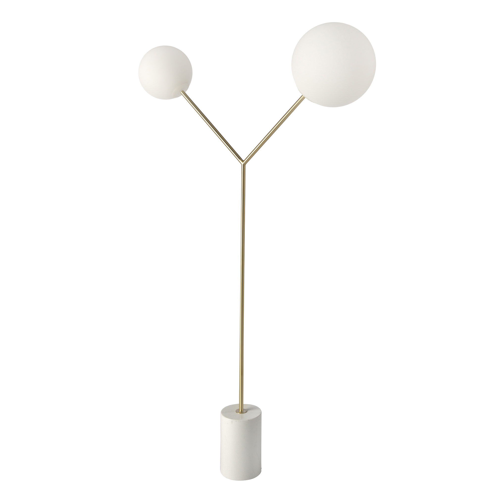• ESTILO: Lampara de Diseño Italiano. Lámpara de pie con base de mármol porcelánico similar calacatta , cuerpo en acero dorado. Dos bulbos de cristal tintado en color blanco.