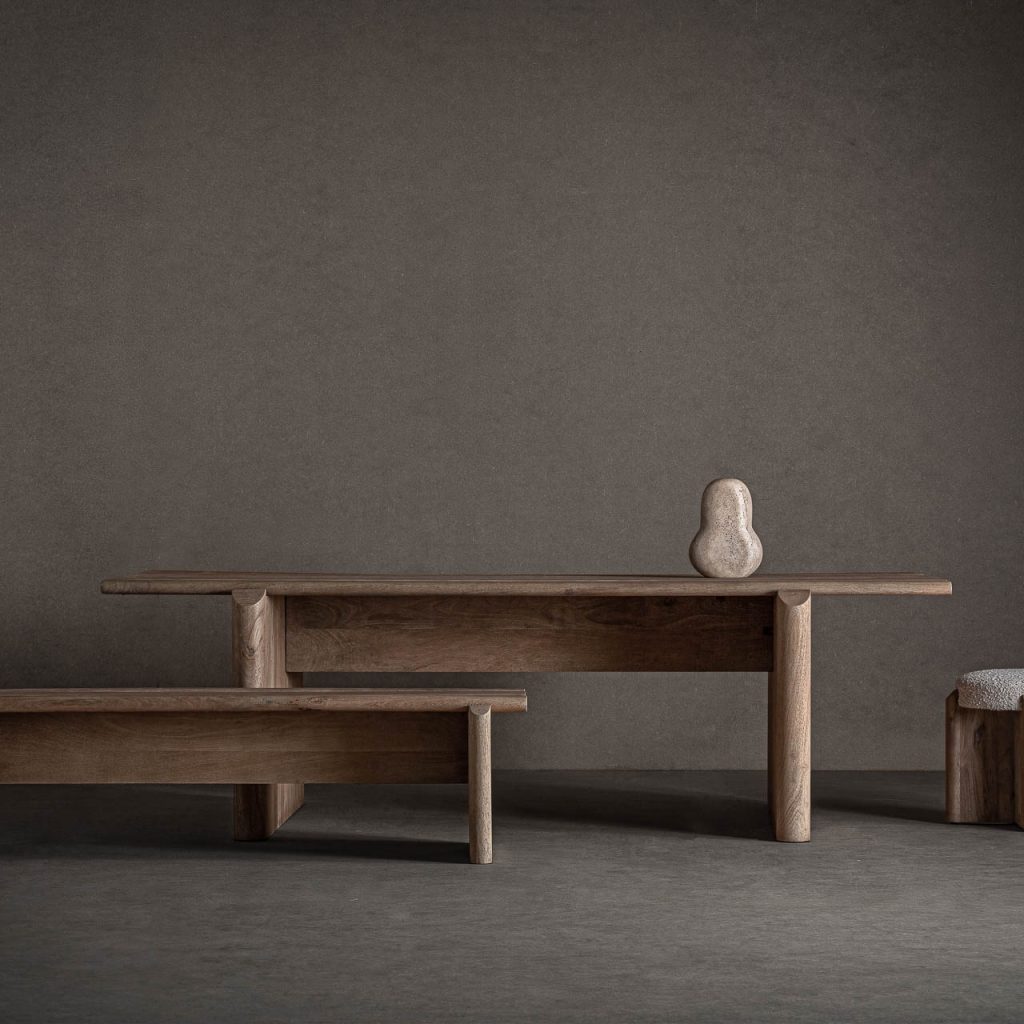 Banco Jacquard de estilo contemporáneo, fabricado en madera de mango en color marrón claro.