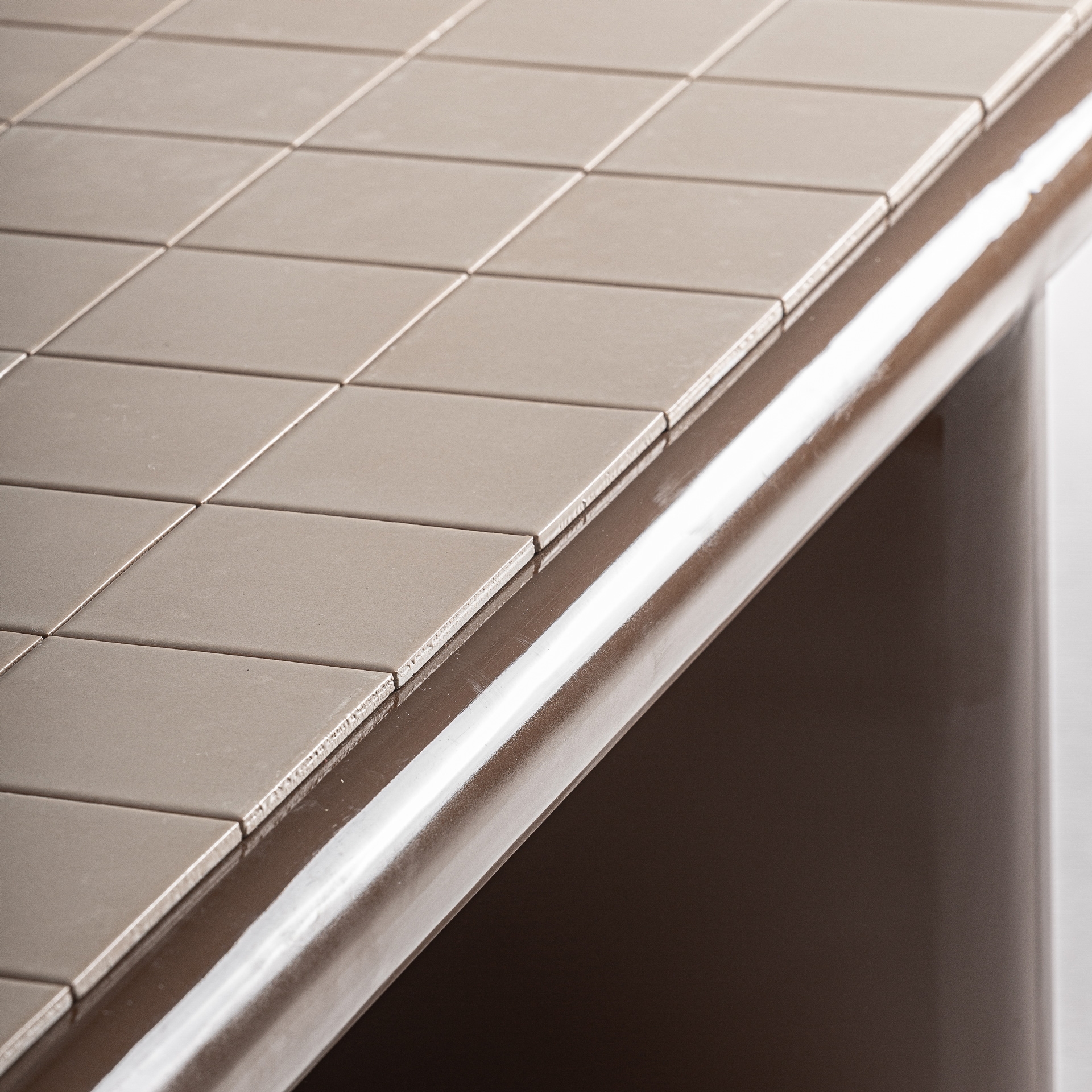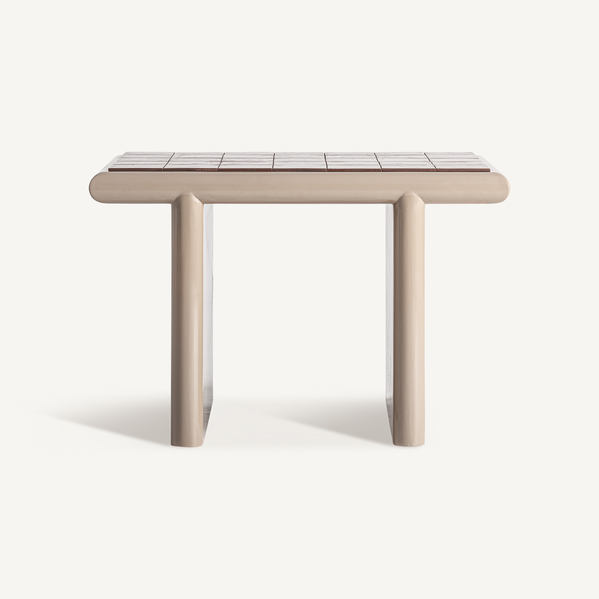 Mesa de centro Kurten de estilo contemporáneo fabricado en madera dm en color marrón combinado con cerámica en color marrón claro.