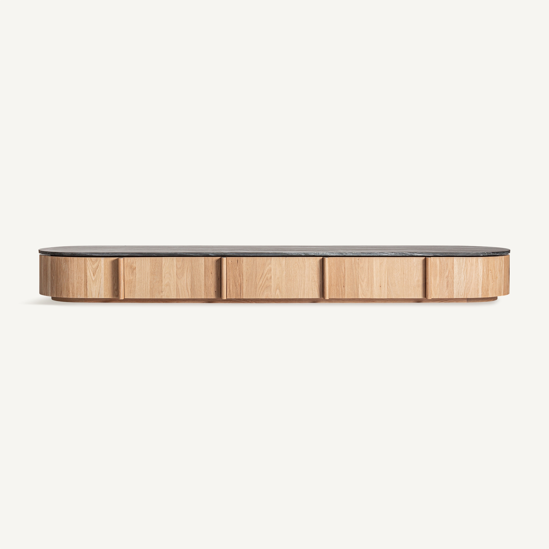 Mueble tv Nara de estilo contemporáneo fabricado en madera roble en color marrón claro combinado con mármol en color negro.