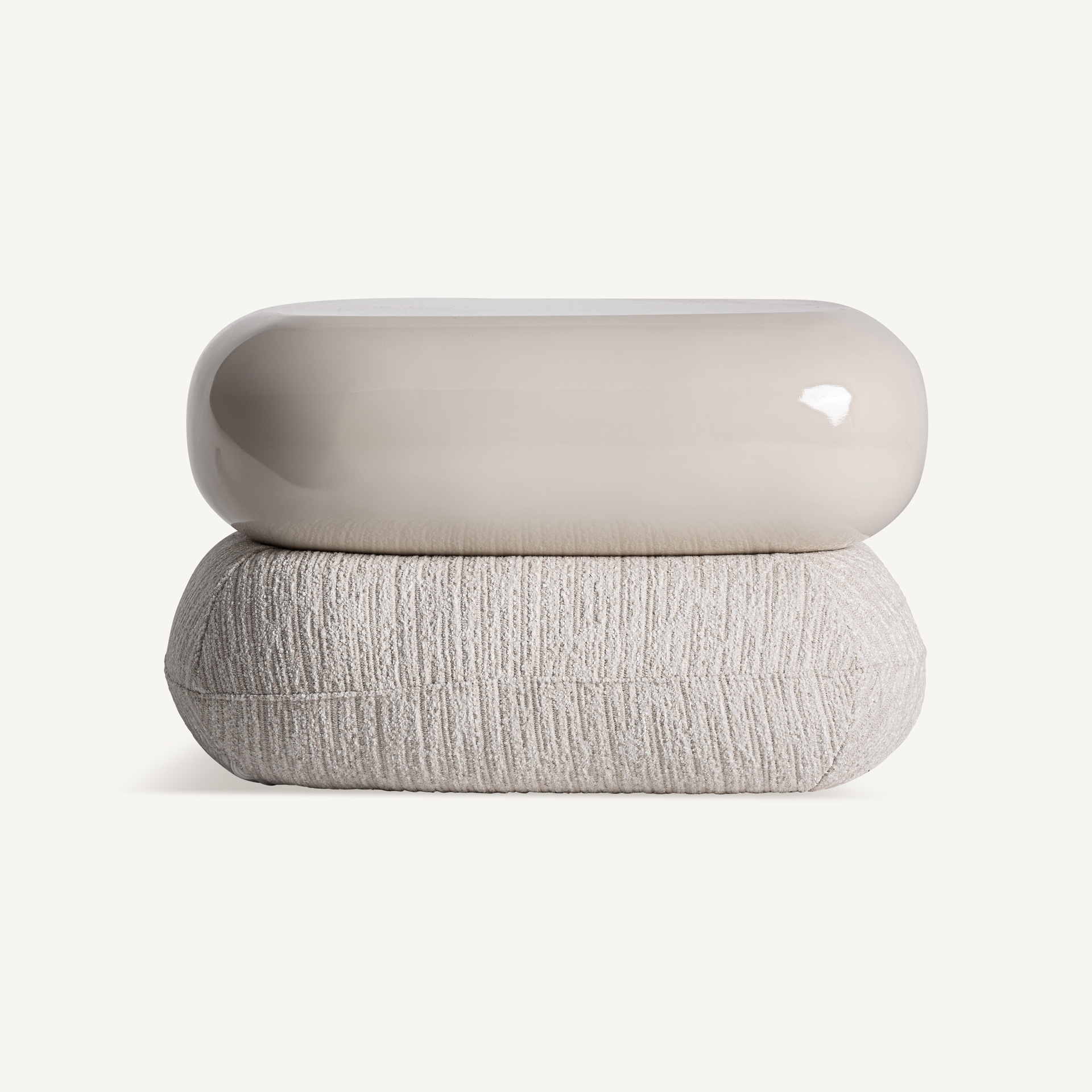 Puff Koto de estilo clásico fabricado en lana en color blanco roto combinado con espuma en color gris. Producto desenfundable.