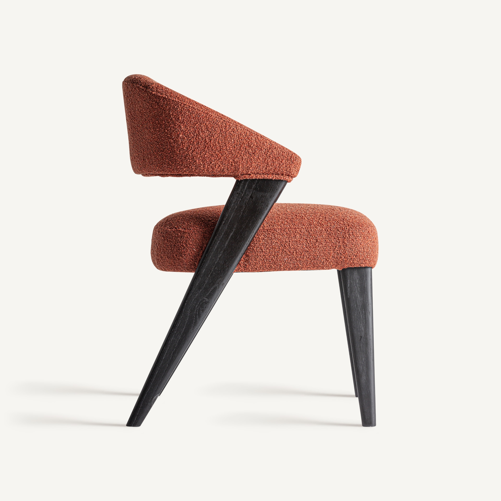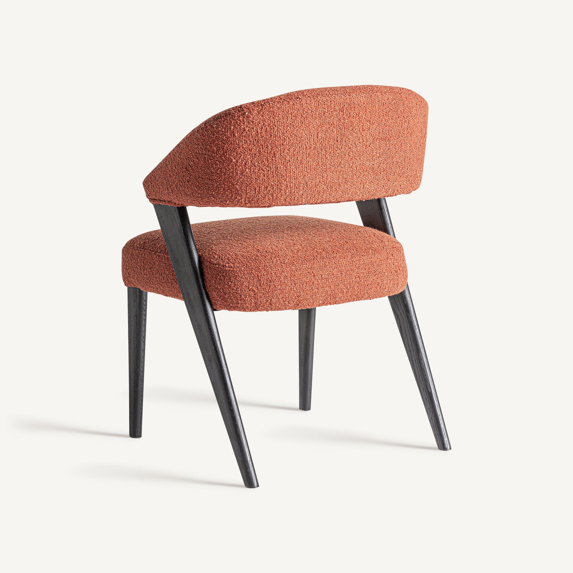 Silla Veney de estilo contemporáneo fabricado en poliéster en color terracota con acabado jaspeado combinado con madera roble en color negro y madera de caucho.