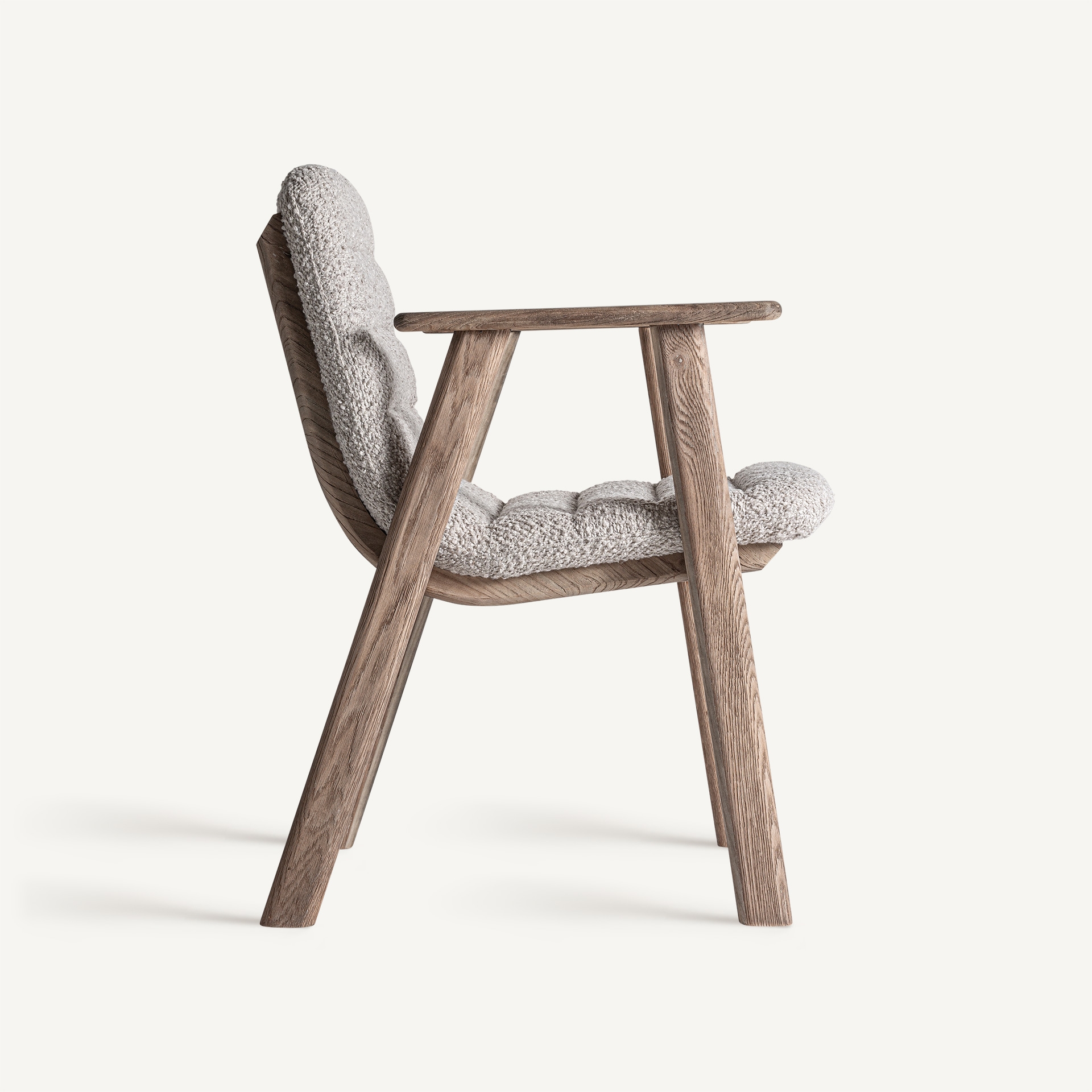 Silla Jacquard de estilo contemporáneo fabricado en madera de olmo en color marrón claro combinado con poliéster en color beige.