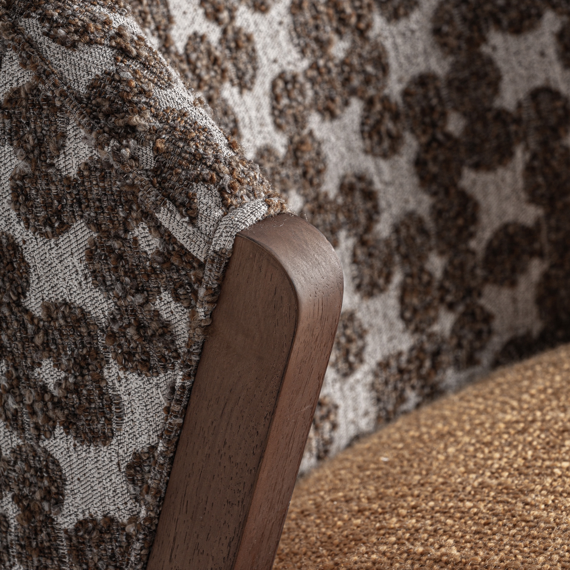 Silla Kalesha de estilo clásico fabricado en madera de caucho en color marrón combinado con algodón en color tonos en marrón en color mostaza.
