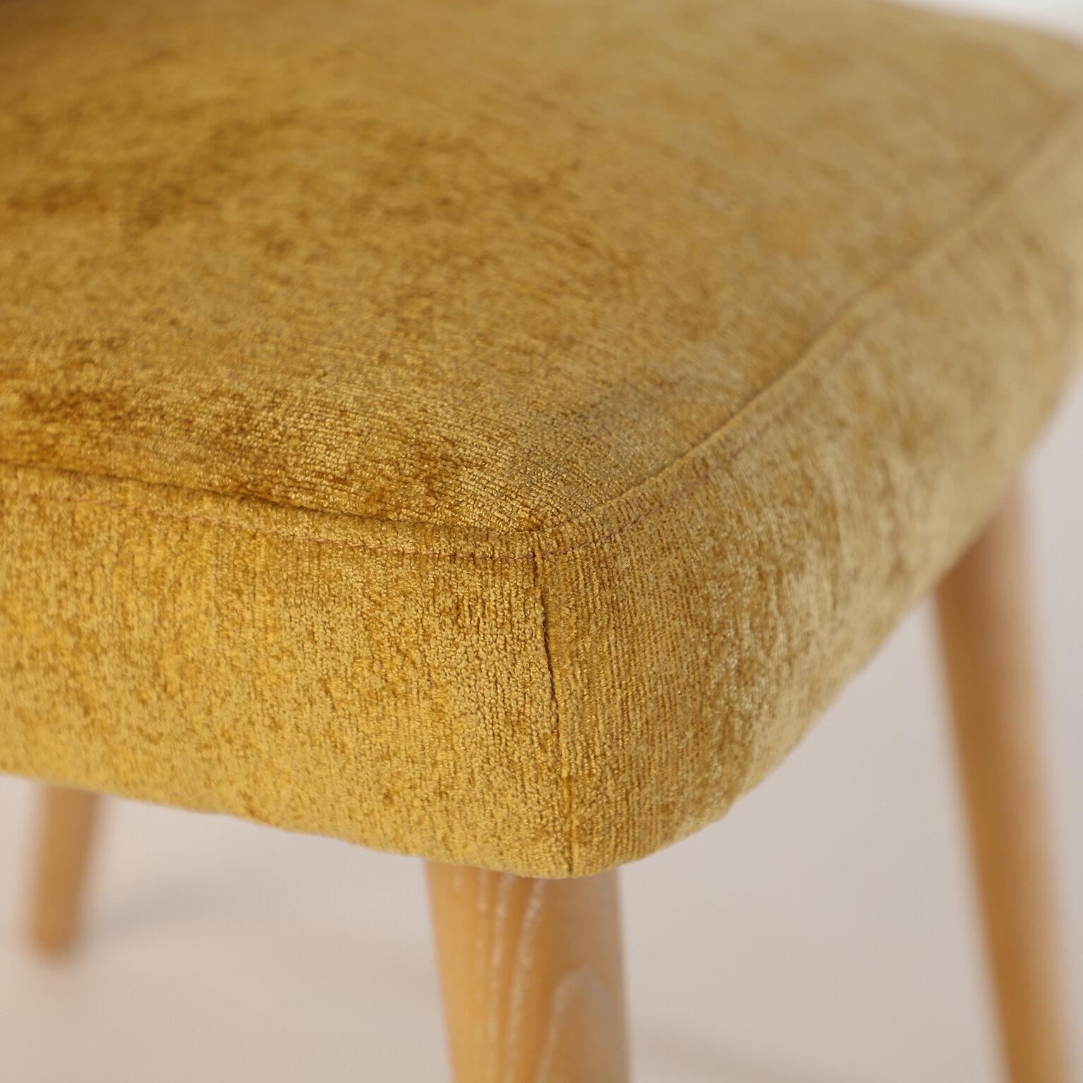 Silla Lage de estilo kitsh fabricado en madera de abeto en color marrón claro combinado con poliéster en color ocre y lino en color tonos neutros. Espuma. Producto desmontable.