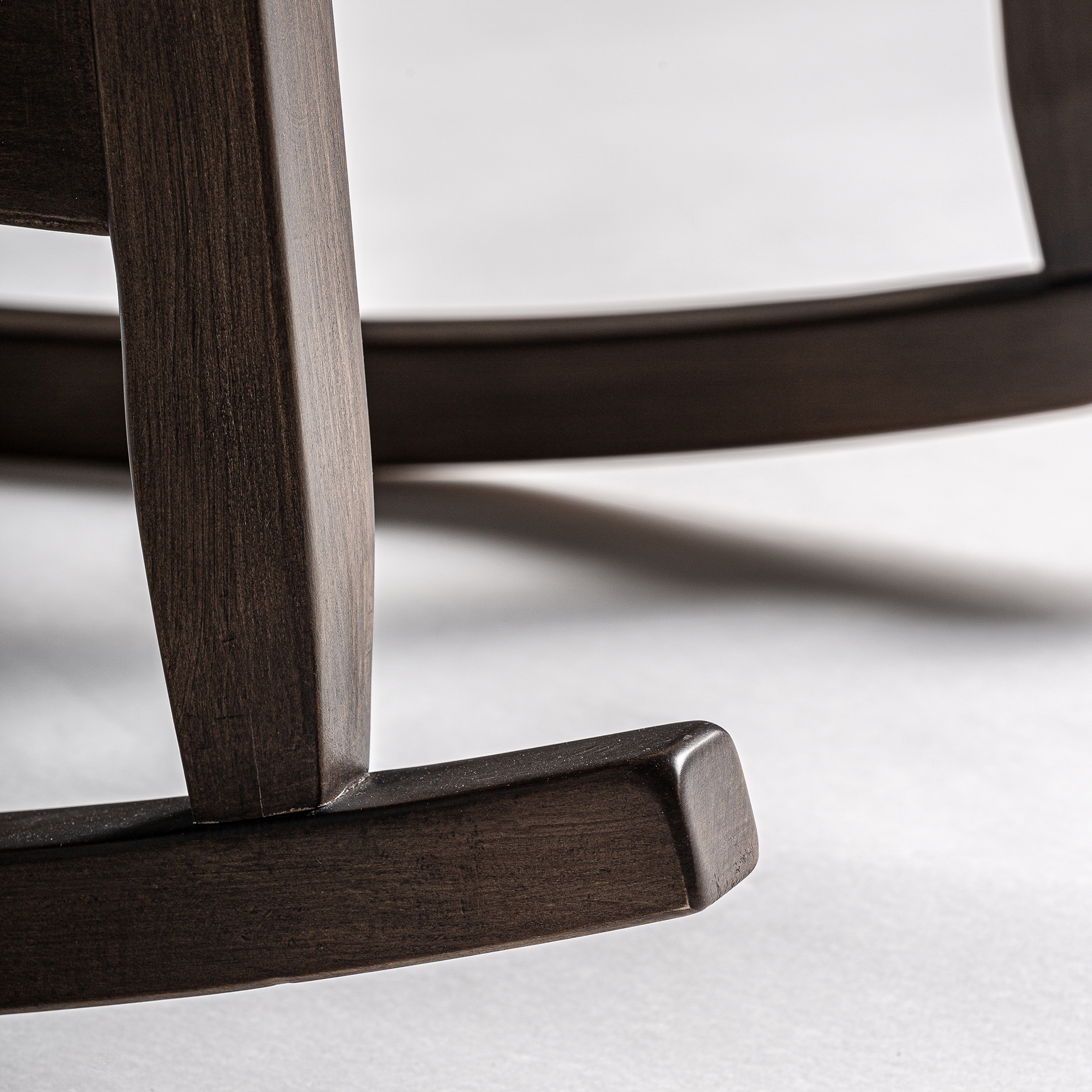 Mecedora kelly de estilo contemporáneo. Fabricado en madera de fresno en color marrón mate combinado con poliéster en color ocre jaspeado.
