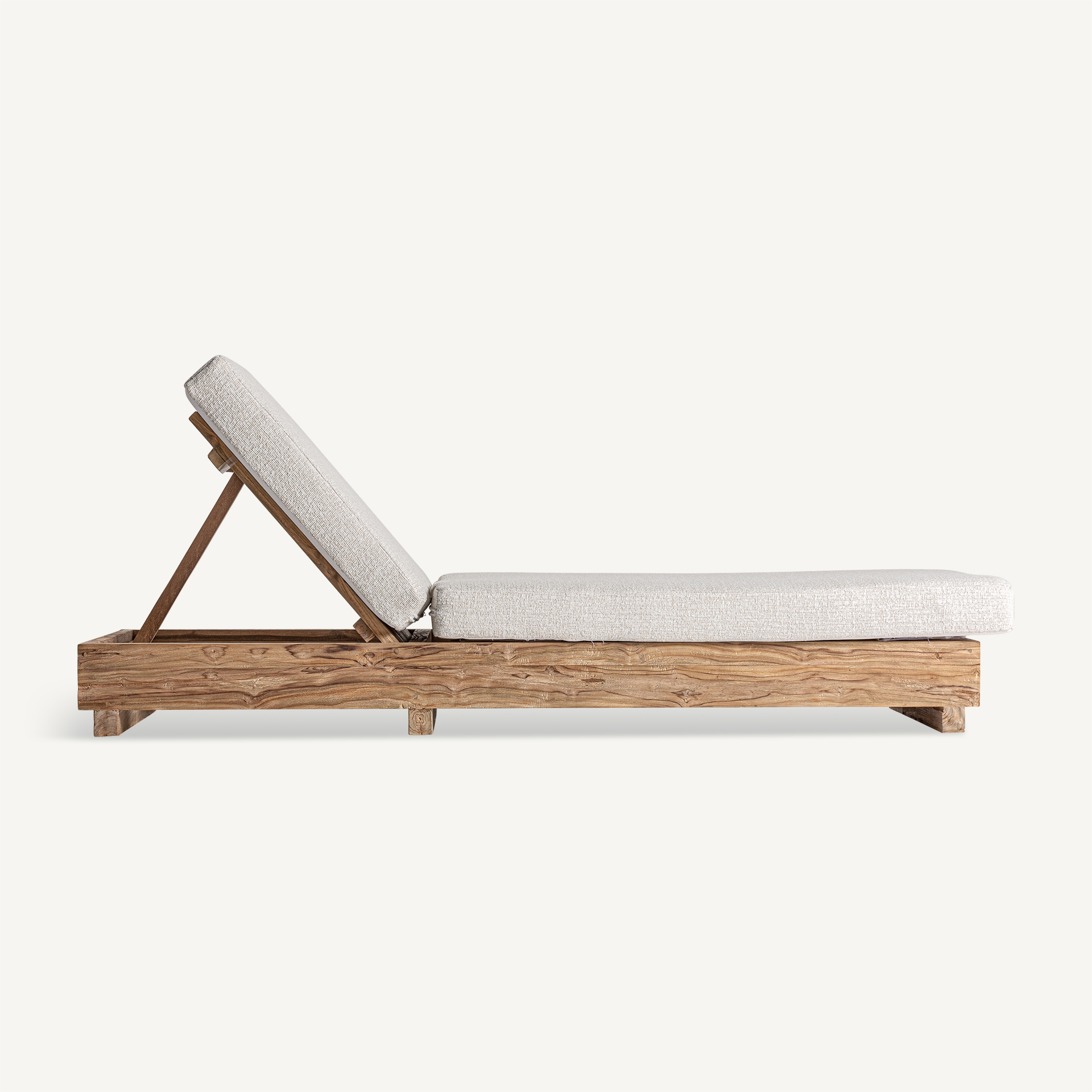 Tumbona pure de estilo colonial fabricado en madera de teka reciclada en color marrón combinado con polipropileno reciclado en color blanco. Producto desmontable plegable desenfundable.